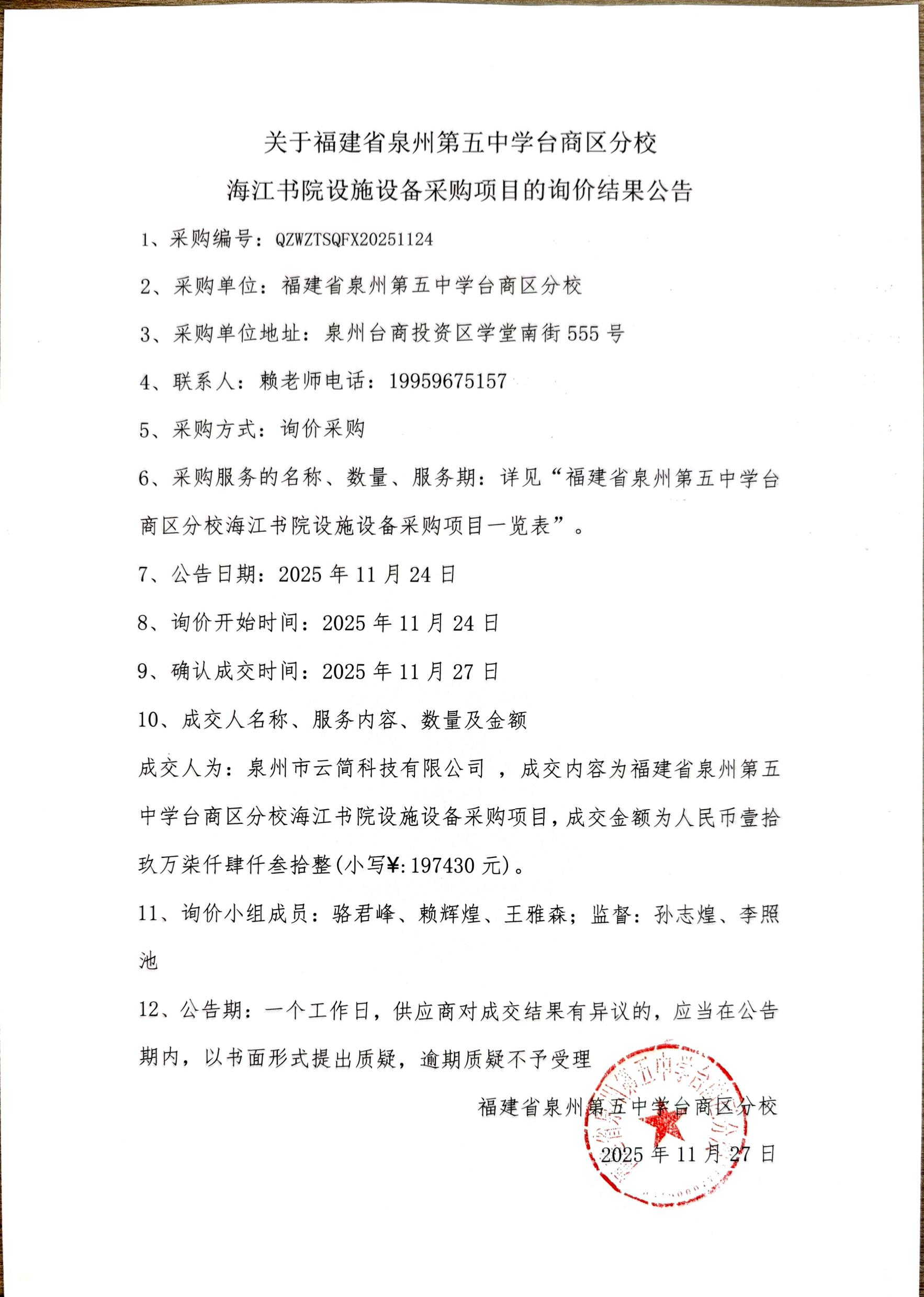 关于福建省泉州第五中学台商区分校海江书院设施设备采购项目的询价结果公告